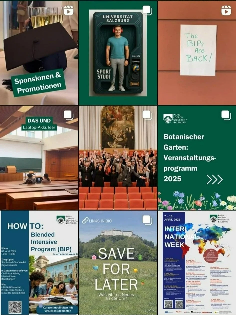 Im Rahmen meines Studiums und meiner aktiven Rolle in der Studienvertretung betreute ich den Social-Media-Account der Universität Salzburg mit Fokus auf den Bereich Molekularbiologie. Mein Ziel war es, die Universität in ihrer digitalen Kommunikation zu unterstützen und durch gezielte Maßnahmen den Informationsfluss sowie die Sichtbarkeit relevanter Inhalte für Studierende zu optimieren.